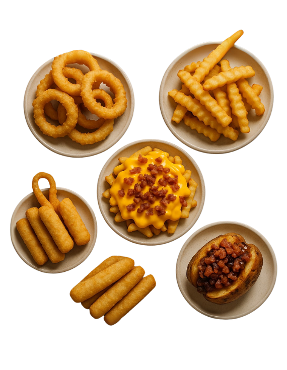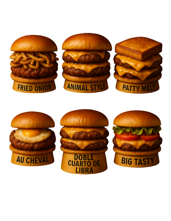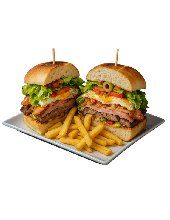 Todas incluyen papas fritas crujientes. Otros acompañamientos y extras disponibles al pedir.