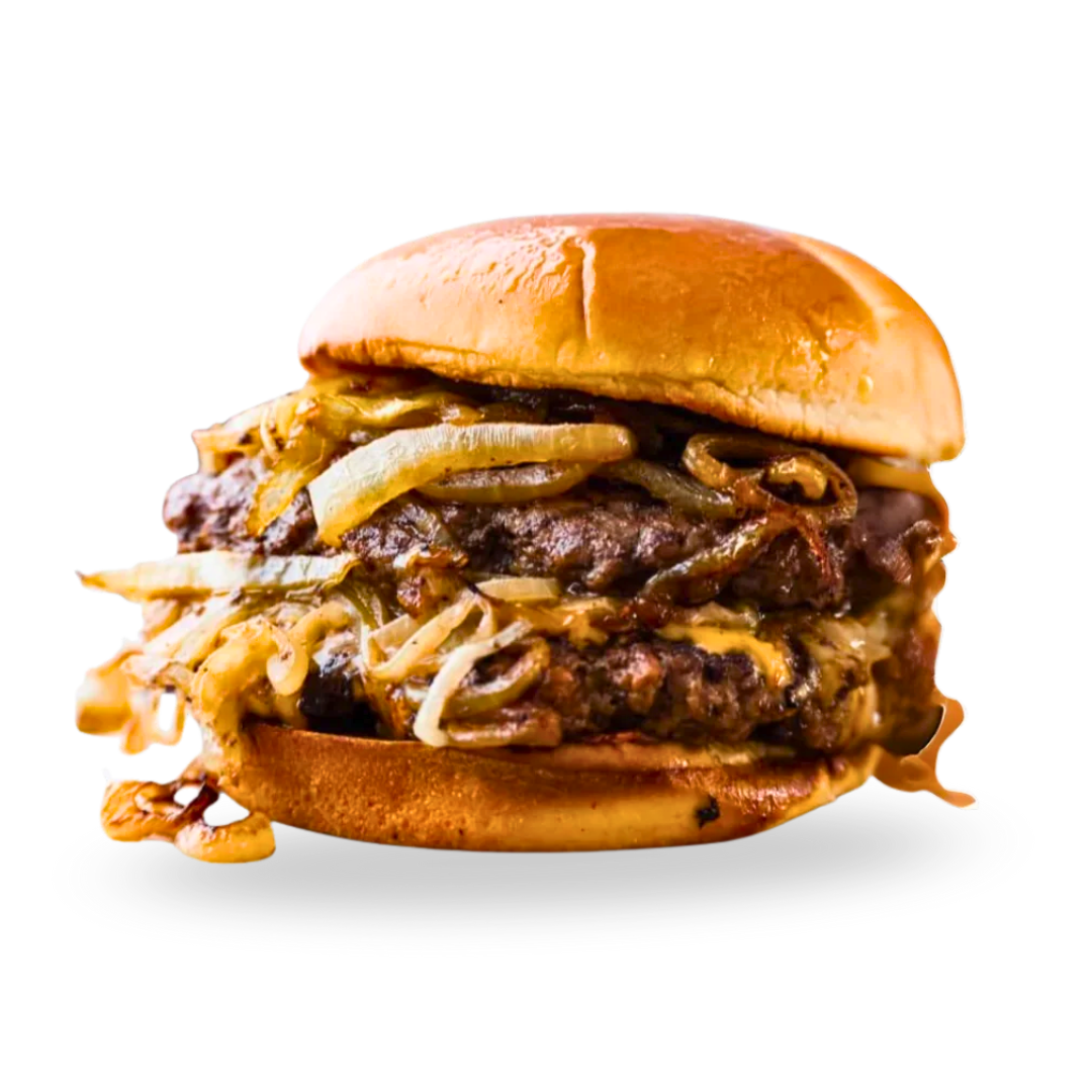 Doble Carne Smasheada con cebolla, cheddar, pepinillos